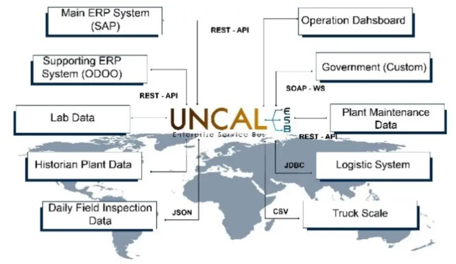 From various systems, the technical implementation of UNCAL ESB in each system has different methods to communicate and can be managed using one platform only and can monitor to see how data transfer is going from one to another. PT MCCI wants to integrate every business process in their corporate, to connect every asset, and connect staff/employees to get employee satisfaction. One of the logistic processes that will be developed is the integration of Weighbridge into the Web Portal which will be able to generate the Surat Jalan (Delivery Orders) and Tempat Penimbunan Sementara (TPS) Online. In this case, the objectives of Digital Transformation in Logistic Systems are: