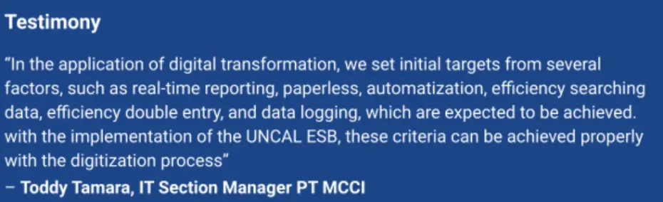 Right now, everything is all about digital. With rapid changes in every sector of industry especially in technology, sector industries should start to do a digital transformation. An example is from the manufacturing industry (PT MCCI) which plans to implement Digital Transformation in business processes and logistic systems. Digitalization will be integrated solutions for the entire enterprise. Every data exchange process between stand-alone systems which is usually done manually, will be integrated automatically so that the exchange of data and information becomes faster, paperless, automated, real-time, more accurate, and supervised. It all can be done with UNCAL ESB. UNCAL ESB functions as an integrator to connect information from various existing systems.